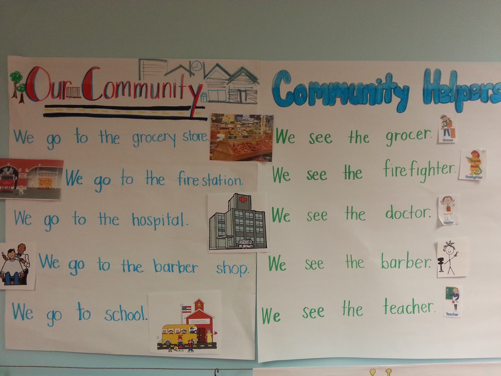 For the last two weeks, we have been discussing our community; the places we go and the community helpers we see there. We made charts which we made and read, and reread as a whole group. The Magic Fishbowl of Questions, introduced last week, asked the students where to find certain words, sentences with 6 words, the sentence that told us who we see at the hopital, etc. I tell ya, I really think there is magic in that bowl. The students are SUPER attentive for those questions.